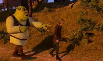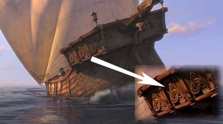 Observation troublante : le navire sur lequel se retrouvent les héros (SHREK, l'ANE et le CHAT BOTTE) est parsemé d’un symbole occulte. Nous y trouvons, tout autour du navire une série de TRIQUETA (du latin « les trois coins »). Ce symbole a plusieurs significations en fonction du contexte dans lequel il se trouve. Ce symbole, présent et rendu populaire dans la série « CHARMED », peut donc signifier la Trinité Chrétienne, mais il est aussi appelé « le nœud Celte ». Dans la sorcellerie il signifie la vie, la mort et la renaissance, ou encore les 3 éléments : l’eau, le feu et l’air, … Dès qu’il est entouré d’un cercle, il porte aussi un autre nom : TRIQUETRA et comme son frère presque jumeau, il a autant de significations que de contextes.